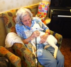 Clarece gets some extra snuggles during a visit to Sunrise Assisted Living Center